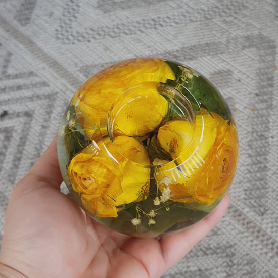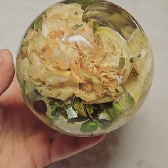 Un altro modo originale di conservare il proprio bouquet di nozze o i fiori di un evento speciale: questo portacandele a sfera in resina e fiori essiccati dona un tocco di luminosità e originalità ad una mensola o a un tavolino da caffè!